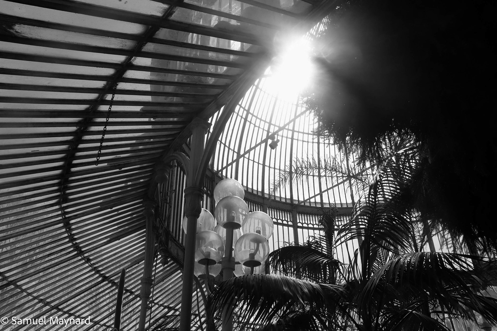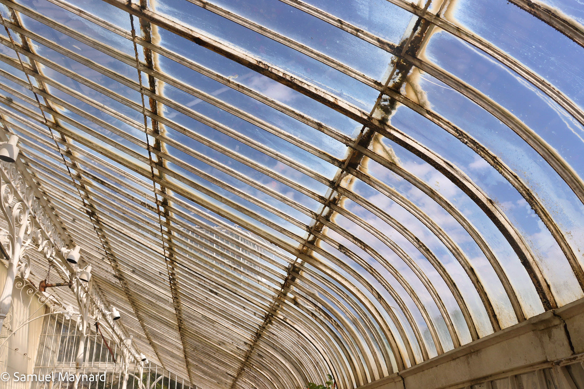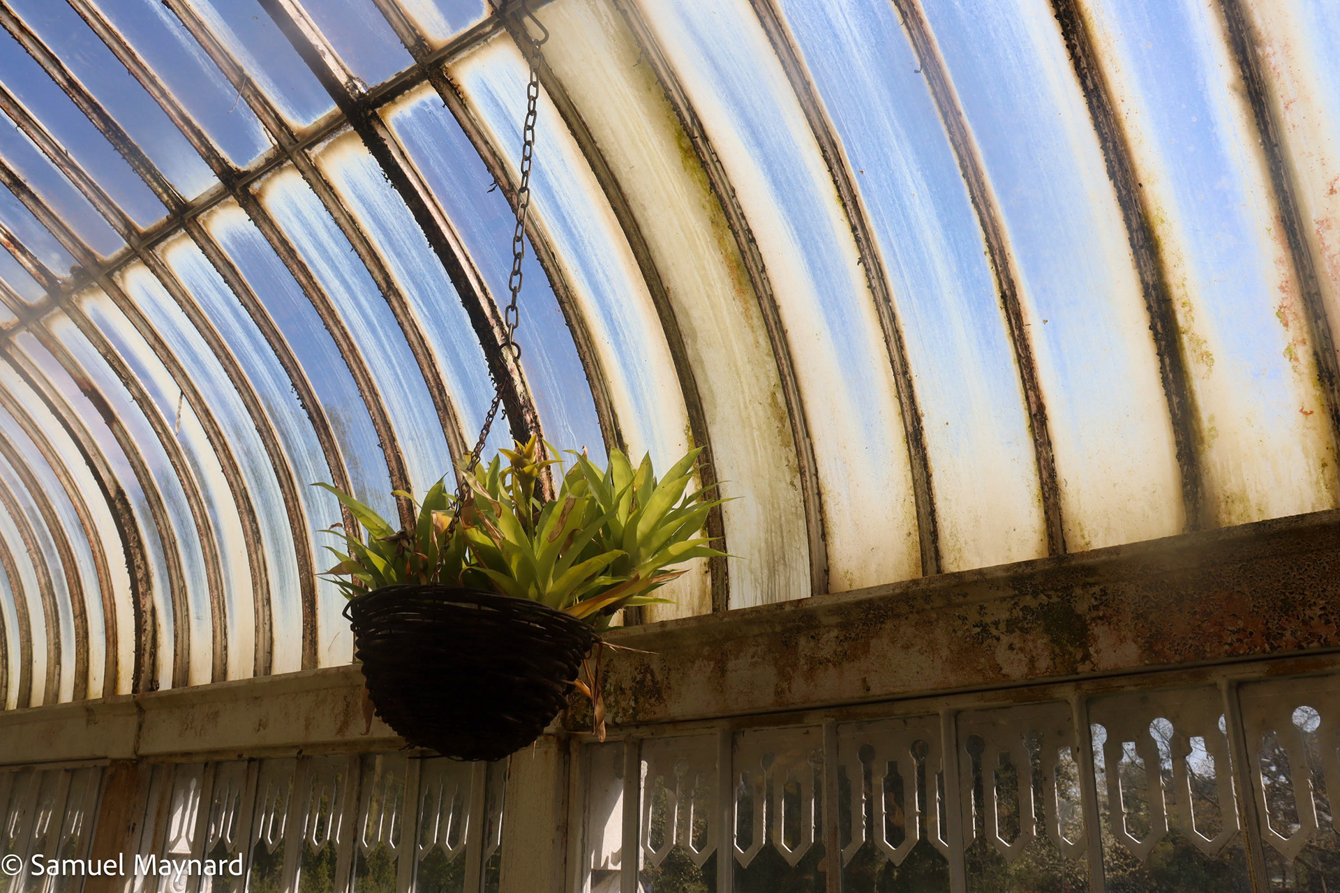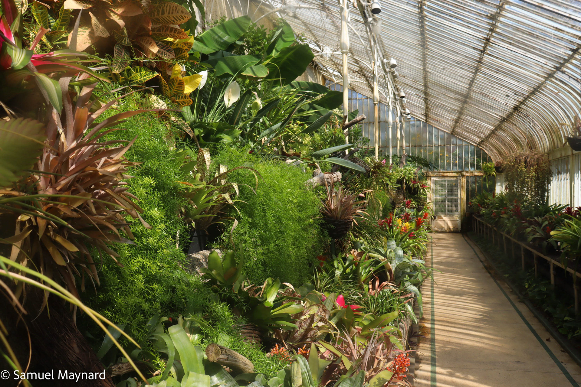 Inside the historic greenhouse building of the Belfast Royal Botanic Gardens in the late afternoon.